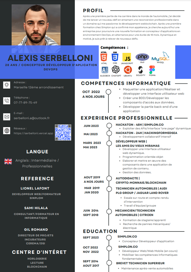 En tant que développeur web passionné, j'ai récemment terminé ma formation et je suis à la recherche d'une opportunité d'alternance pour suivre une formation de concepteur développeur d'application avec une certification DevOps. En parallèle, je suis également à la recherche de petits projets qui me permettraient de perfectionner les compétences que j'ai déjà acquises.