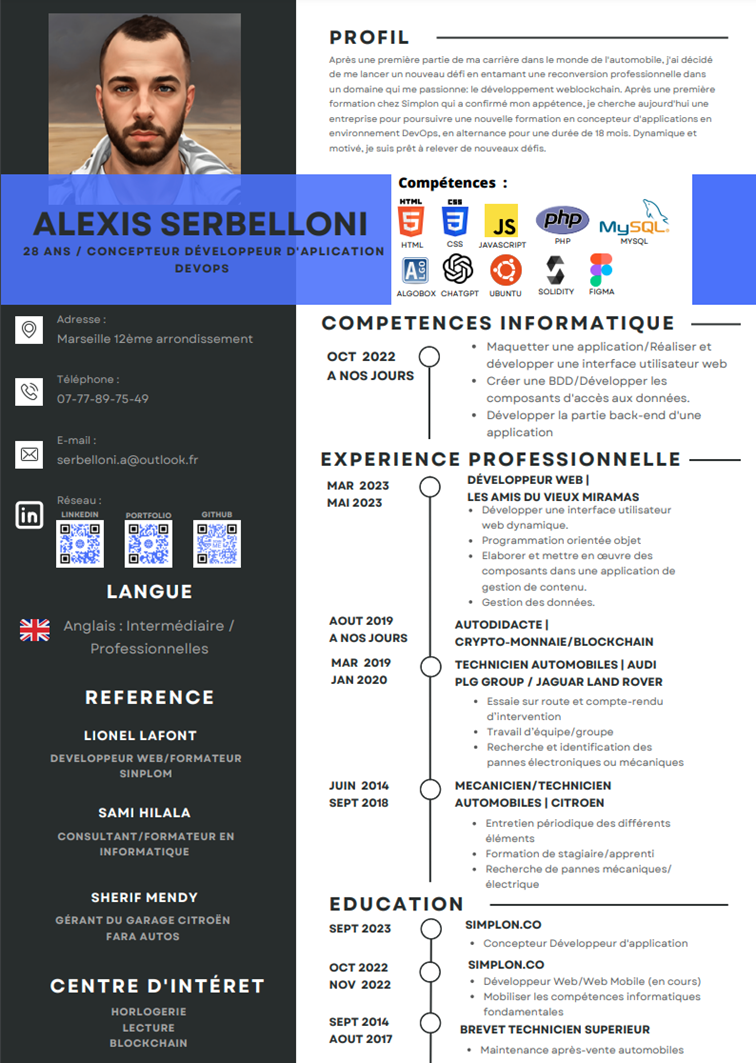 En tant que développeur web passionné, j'ai récemment terminé ma formation et je suis à la recherche d'une opportunité d'alternance pour suivre une formation de concepteur développeur d'application avec une certification DevOps. En parallèle, je suis également à la recherche de petits projets qui me permettraient de perfectionner les compétences que j'ai déjà acquises.
